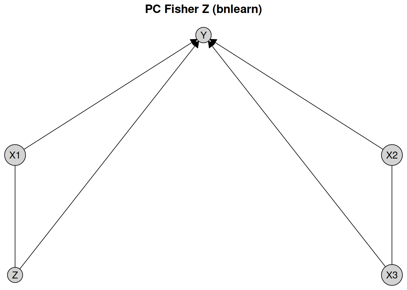 test = "fisher_z", # Use Fisher's Z test for conditional independence