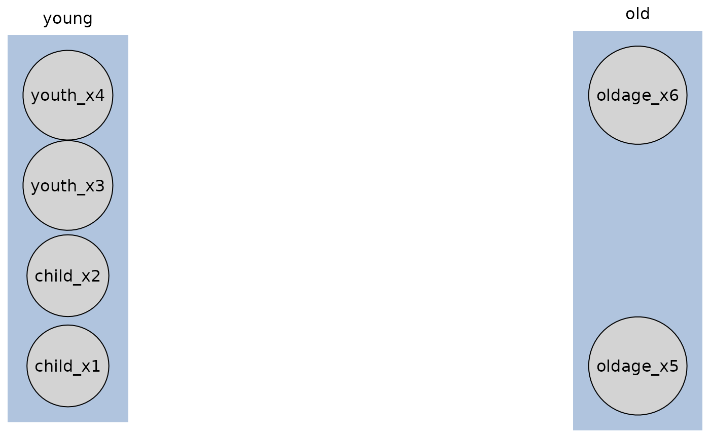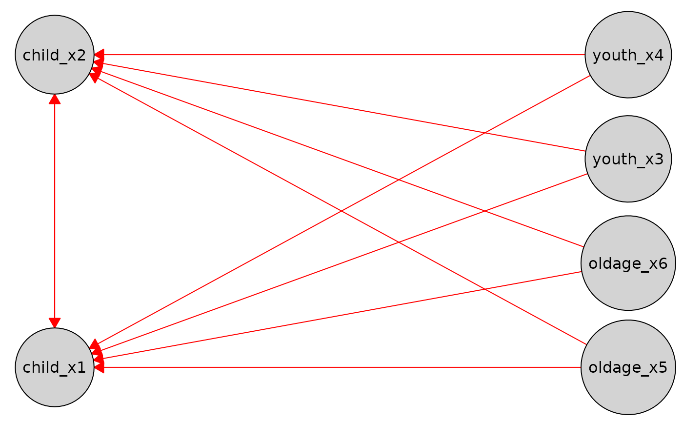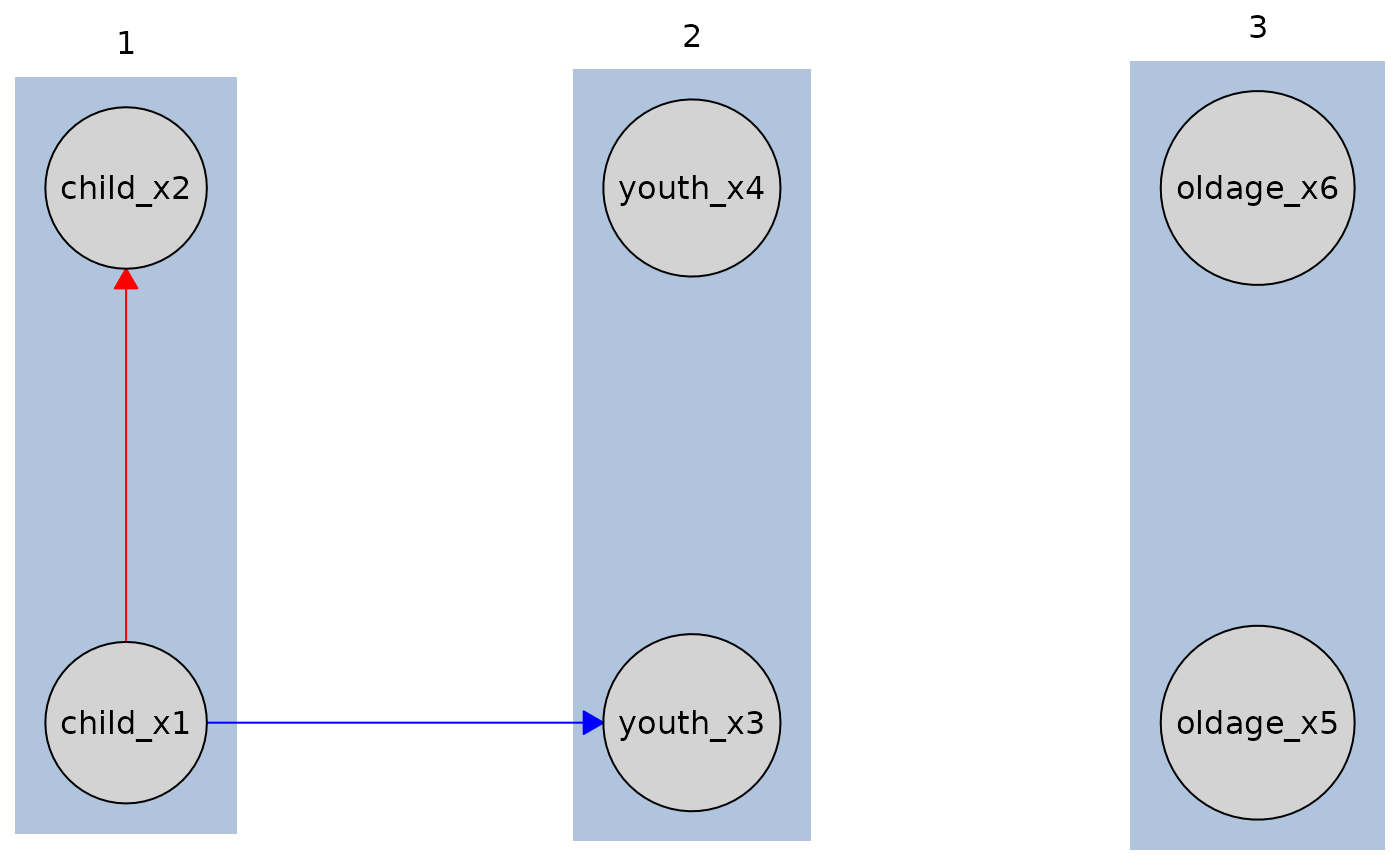 )This means, that all variables starting with “child” are required to have edges to all variables starting with “youth”, and no variables starting with “oldage” can have edges to any variables starting with “youth”. We can visualize this: