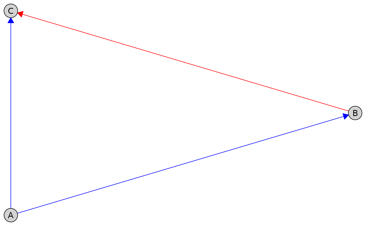 The blue edge represents the required edge from A to B, while the red edge represents the forbidden edge from B to C.